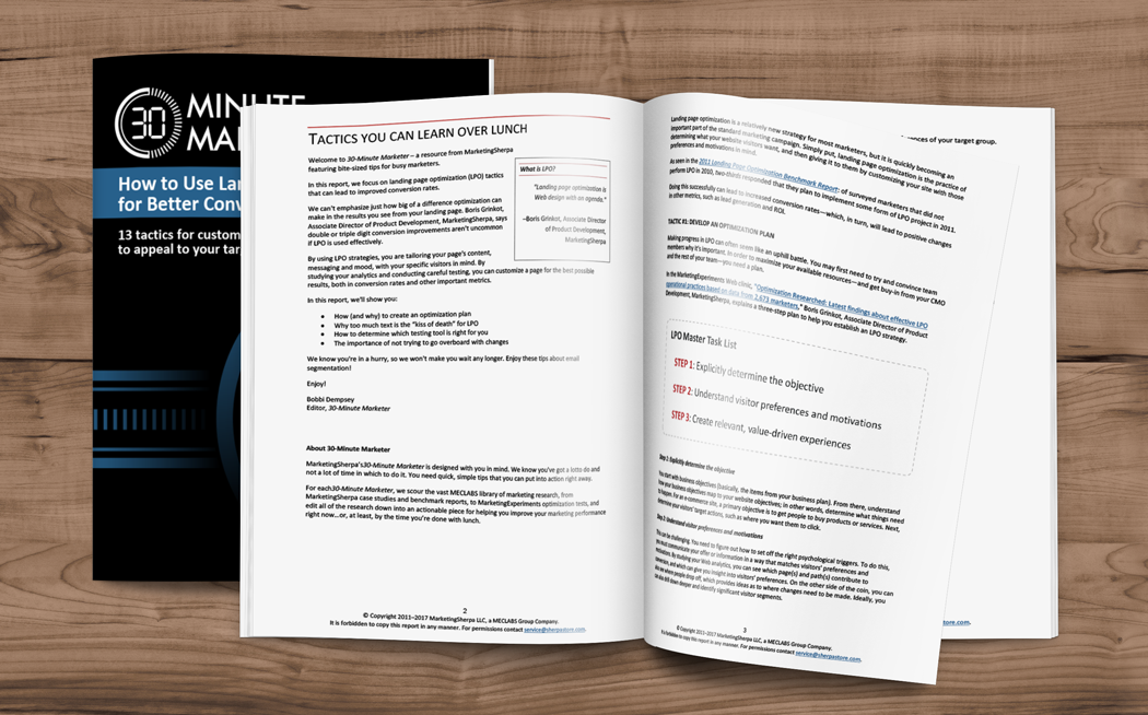 Welcome to 30-Minute Marketer — a resource from MarketingSherpa featuring bite-sized tips for busy marketers. In this report, we focus on landing page optimization (LPO) tactics that can lead to improved conversion rates.