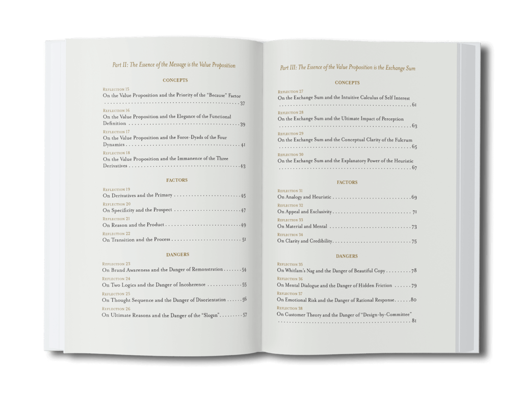 12 reflections in each section. Eight reflections expound upon the core proposition. Four reflections touch on the critical dangers the marketer must consider.