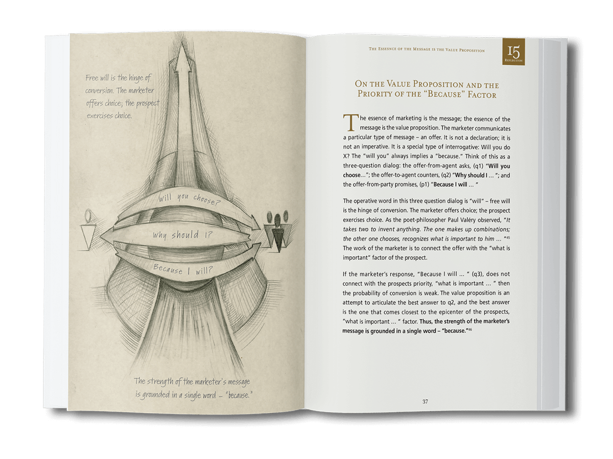 12 reflections in each section. Eight reflections expound upon the core proposition. Four reflections touch on the critical dangers the marketer must consider.
